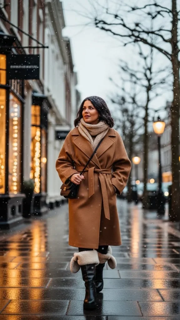 A wool coat is a winter staple, and pairing it with faux fur-trimmed boots adds cozy charm. Stick to earth tones like camel, brown, or beige to keep the look coordinated. Keep your outfit simple underneath with a fitted sweater and slim trousers. Faux fur boots are an affordable way to add a luxe touch without real fur or high costs. Use matching mittens or a fur-trimmed hat to tie the look together.