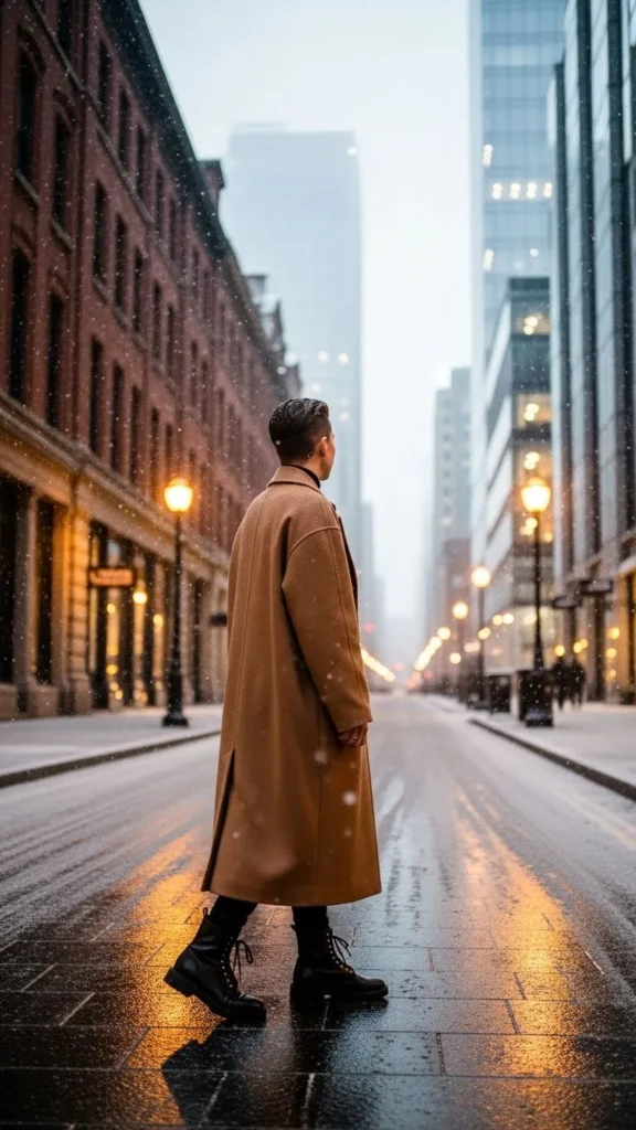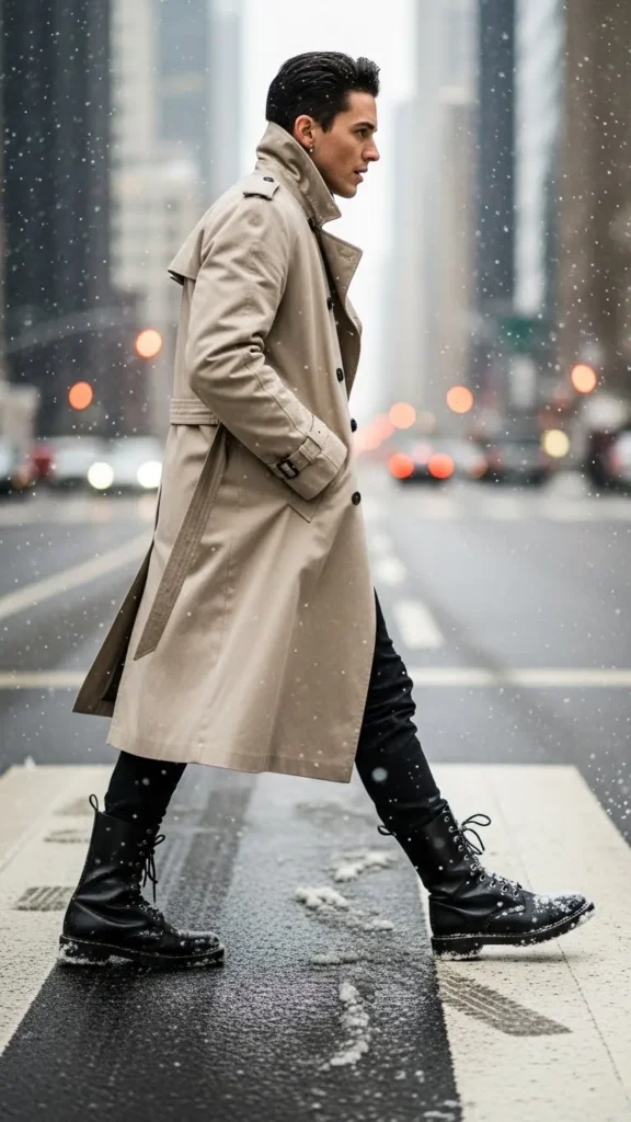 The trench coat’s timeless look mixes well with the ruggedness of combat boots. This combination balances sophistication with edge. Wear skinny jeans or black leggings underneath for streamlined lines. Add a scarf or hat for extra warmth. Combat boots are often budget-friendly and rugged enough for winter streets. Keeping your boots clean with regular polishing will keep the outfit sharp over time.