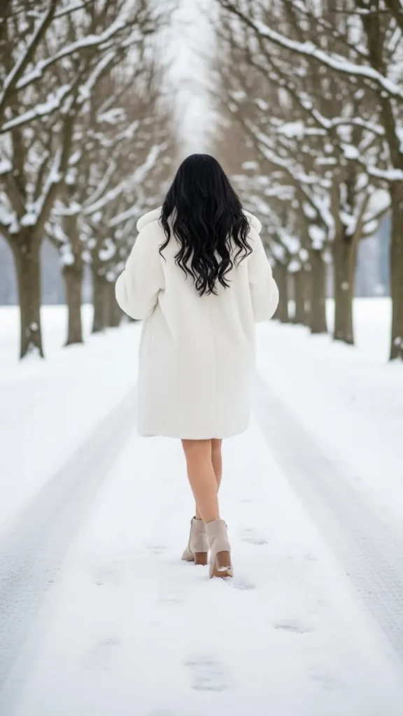 Faux fur coats paired with suede ankle boots create a glamorous winter look. Keep colors light or neutral to enhance the softness of both pieces. This outfit is great for casual dinners or dates. Add a simple knit sweater or blouse underneath to keep things easy. Faux fur coats often appear in sales and can be styled many ways, an excellent investment even on a budget.