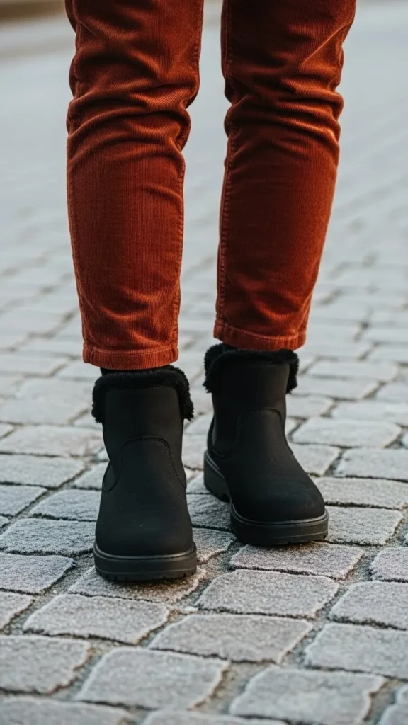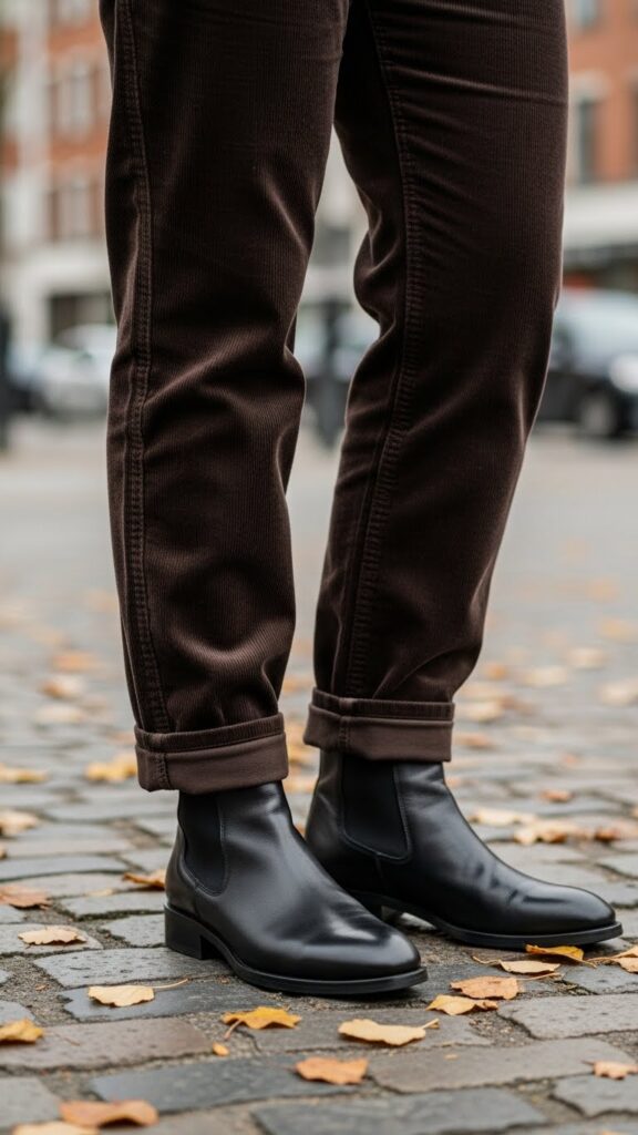 Corduroy pants add texture that complements ankle boots beautifully. Choose boots with a slight heel for a subtle lift. Crop or cuff your pants to show off the boots and avoid covering them up. Balance out the thickness of the corduroy with a slim-fit turtleneck or blouse. This outfit feels retro and modern at once. It’s perfect for weekend strolls, and you can swap the boots for budget-friendly versions from thrift stores.