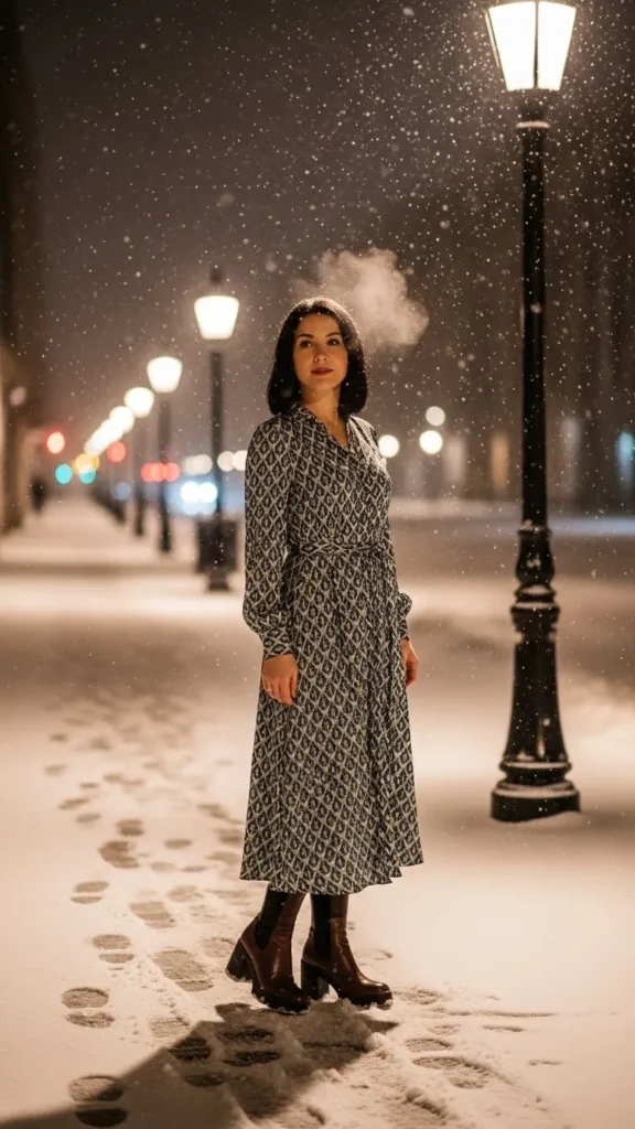 A knitted sweater dress pairs perfectly with chunky lace-up boots. The boots bring sturdiness, while the dress keeps the outfit warm and on-trend. Add thick tights for extra insulation. This outfit looks high-end but is easy to assemble. Stick to neutral tones like grey, cream, or black for a versatile look. Layer with a long wool scarf to stay extra warm, and throw on a beanie if you’re stepping outdoors.