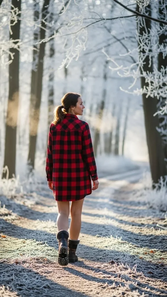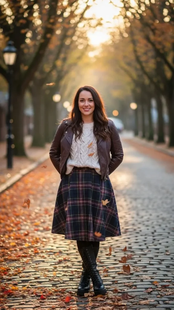 Make skirts winter-friendly by pairing them with lace-up winter boots. Choose thicker tights or thermal leggings underneath. A chunky sweater or a denim jacket layered over a thermal top balances the feminine skirt with rugged boots. This combo is great for weekend outings or casual office days. For budget tips, thrift plaid skirts and look for boots on discount sites during winter clearance.