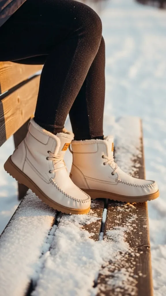 Thermal leggings paired with cozy moccasin boots make a snug outfit for chilly days. Moccasins have soft soles and often come lined with plush fur. Wear with oversized sweatshirts or flannel shirts for simple layering. These boots often come at an affordable price and have a relaxed vibe. Handmade or DIY moccasin-style slippers can also be a budget win for home or brief outdoor use.