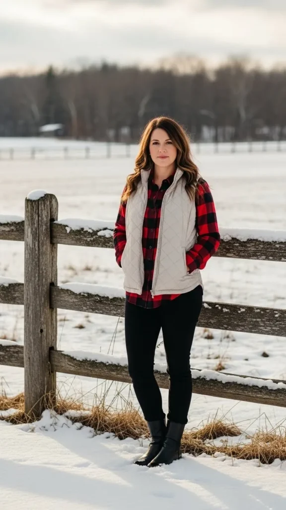 A quilted vest paired with skinny boots is a casual winter combo. It keeps your core warm without heavy layers, which means more flexibility. Wear with skinny jeans or leggings so the boots shine. This look pairs well with flannel or layered sweaters. Look for quilted vests at discount outdoor stores or sales, and keep your boots simple with a waterproof spray to prolong their life in wet weather.