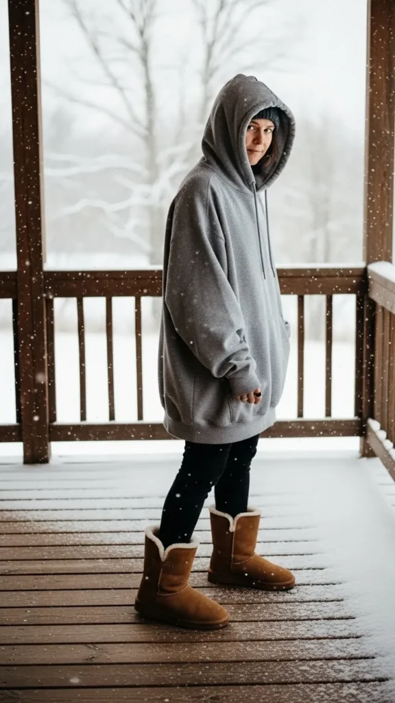 Comfort meets style in an oversized hoodie and shearling boots. Perfect for lounging or quick errands, this look is cozy without fuss. Shearling boots keep feet warm and add texture. Pair with leggings or joggers that tuck into the boots neatly. Keep the look monochrome or choose neutral shades for easy coordination. Shearling boots can be found on sale at many retailers if you watch seasonal sales.