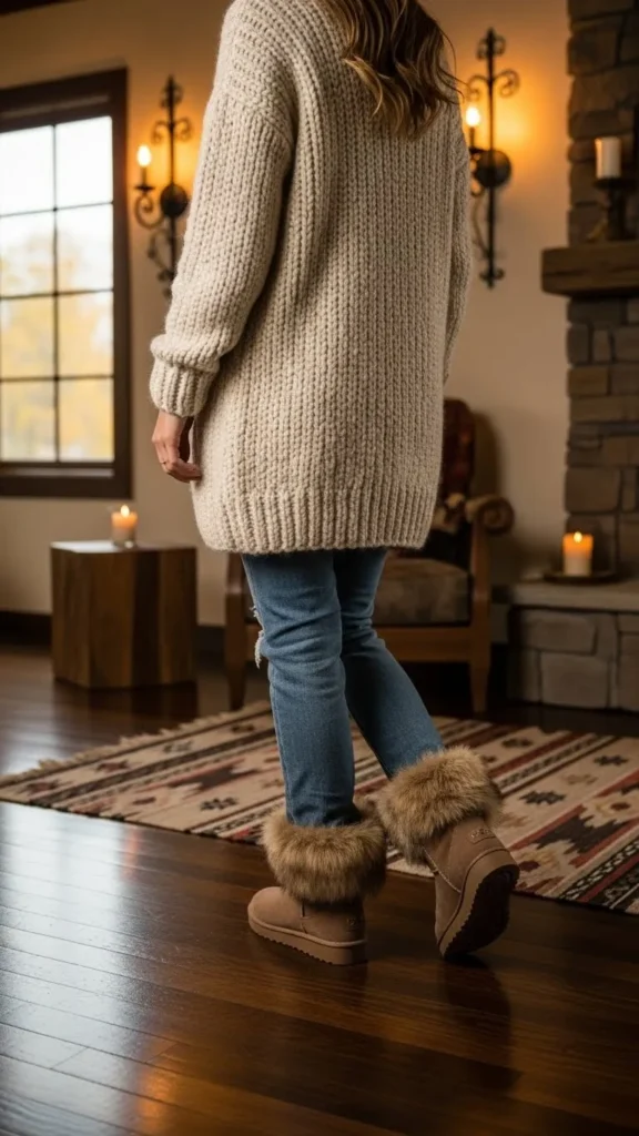 Knitted cardigans offer comfort and style. Combine with fur-lined booties and casual jeans for an inviting weekend look. This outfit is easy and affordable since cardigans and booties can be thrift or sale finds. Keep the colors soft and neutral to emphasize coziness. A lightweight scarf or crossbody bag completes the look without fuss.