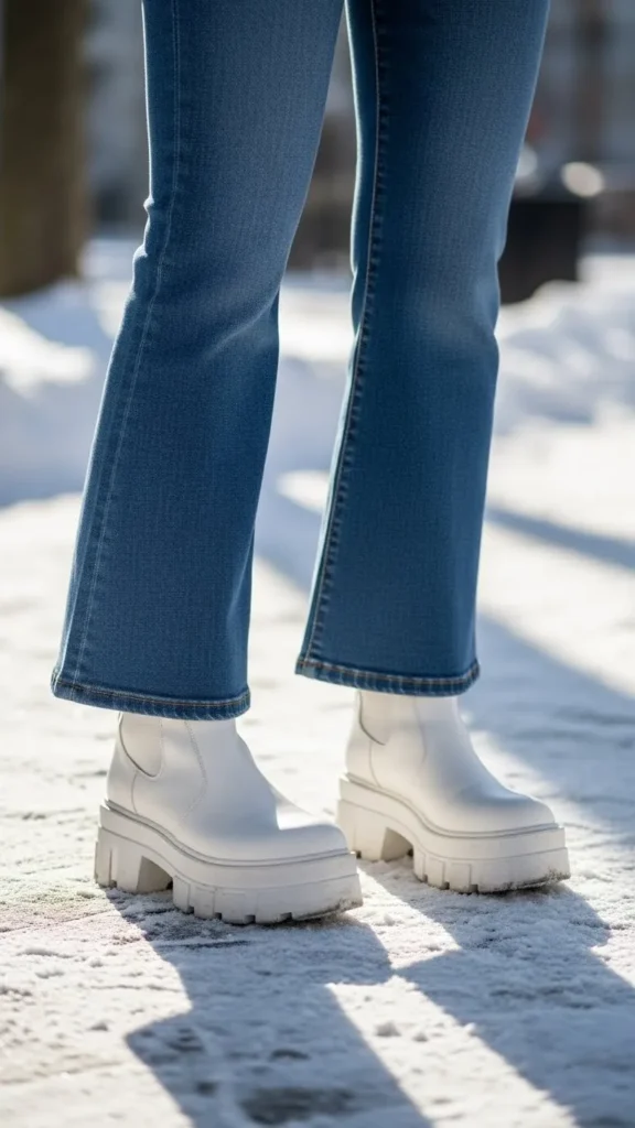 Flared jeans get a modern upgrade with platform boots. The platform adds height and tones down the wider leg of the jeans. Choose boots with rubber soles for grip in icy conditions. The contrast of casual denim with bold boots creates fun energy. Pair with a tucked-in sweater and an oversized blazer or coat for extra polish. Platform boots can be surprisingly affordable when bought off-season.
