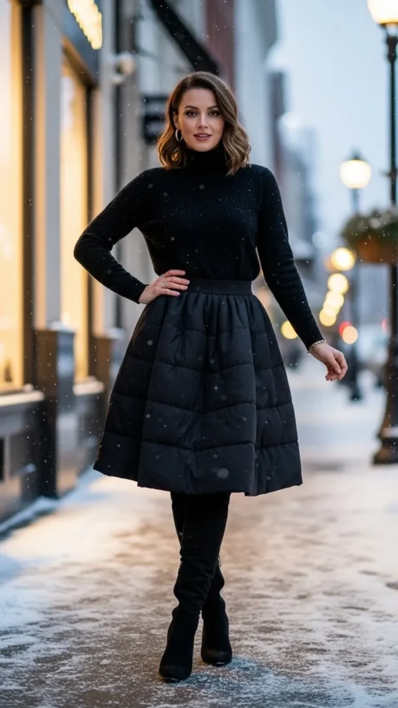 A puffy skirt might seem summer-only, but tall winter boots can make it winter-ready. Pair with thick tights and a cropped sweater or fitted jacket. This look adds volume but remains balanced with the sleek boots. Pick boots without excessive hardware for a cleaner look—this keeps things simple, practical, and budget-friendly. This combo is great for casual and slightly dressy winter events.