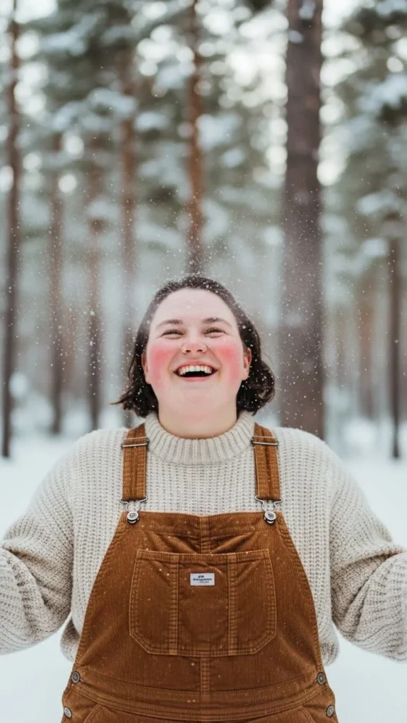 Corduroy overalls in brown paired with a cream knit sweater add a playful touch. Corduroy is durable and textured, great for winter warmth. Overalls can often be thrifted inexpensively. Layer with a soft sweater or long sleeve tee beneath. This outfit is effortless and practical for cold weather adventures.