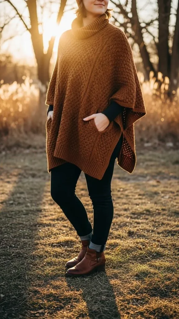 A brown knit poncho adds a soft layer that’s easy to wear and looks great with skinny jeans and boots. Ponchos can be handmade with simple knit patterns or bought affordably. They’re practical and add visual interest without fuss. Add leggings underneath for extra warmth if outdoor temps drop.