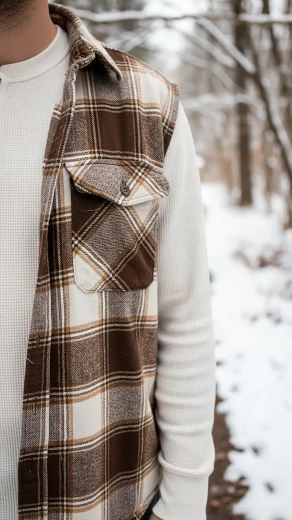 Brown plaid flannel shirts are a classic winter piece. Layer over a snug thermal top for warmth without weight. Pick flannels on sale or from second-hand shops. Thermals are inexpensive basics and add a soft layer under your shirt. Roll sleeves or leave casually open for a laid-back vibe. Pair with cozy boots or thick socks layered under shoes.