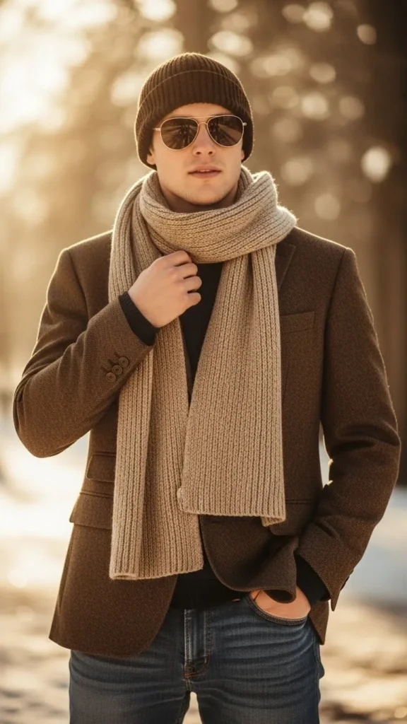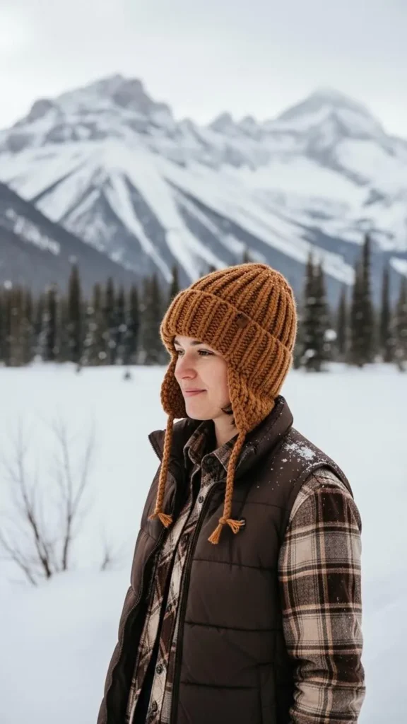 Rustic brown vests are timeless winter layering pieces. Wear over a denim shirt for a rugged yet cozy vibe. Wool socks peek through boots to complete warmth and style. You can DIY vests by cutting and sewing sturdy fleece or wool fabrics. Mix textures for a visually appealing but easy-on-the-budget outfit.