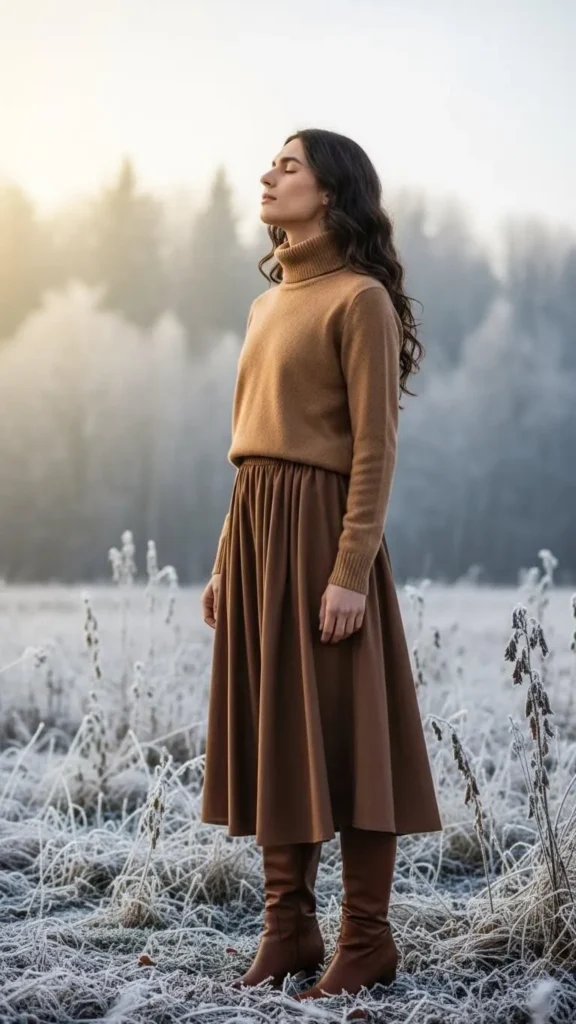 Finish with an earthy brown sweater and maxi skirt for a boho winter look. Layer with a faux fur coat for extra softness and luxury feel. Faux fur coats can be found at reasonable prices during sales. Shop for skirts at thrift stores or repurpose longer dresses. This combination feels warm yet playful. Winter brown outfits bring comfort with effortless style through texture, layering, and earthy tones. Experiment with basics, thrift finds, and DIY updates to create looks you’ll enjoy wearing all season. Try these looks one at a time or mix and match pieces to create your personal cozy winter vibe. Grab a warm cup, bundle up, and enjoy the simplest pleasure of feeling soft and snug in brown this winter.