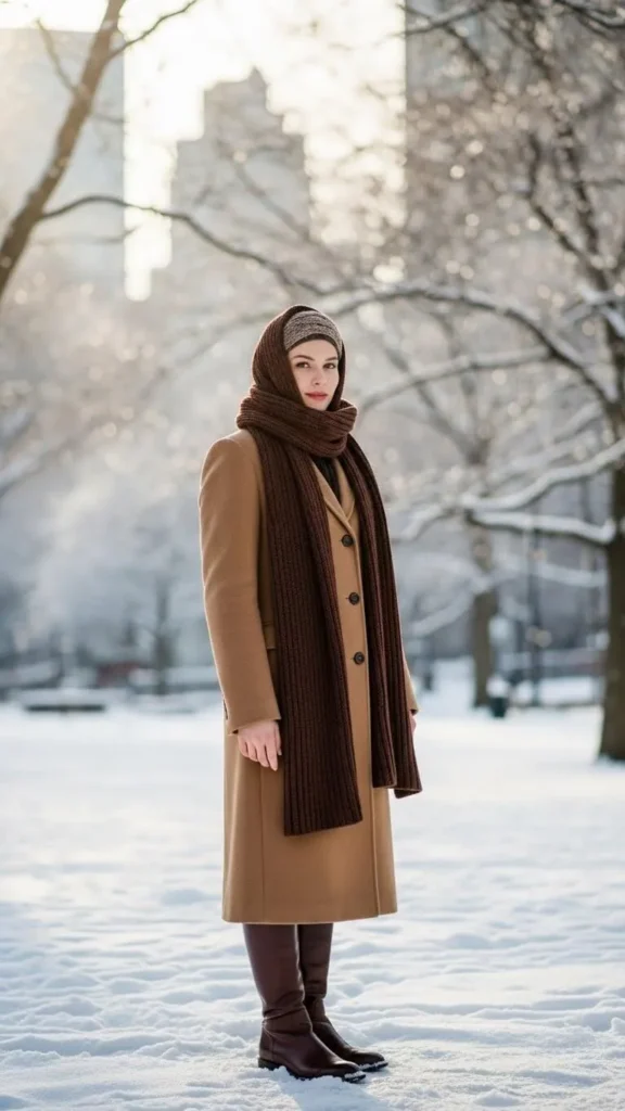 A camel coat is a great investment piece for winter. It works beautifully when paired with a darker brown scarf and matching leather boots. This combo layers warmth and style in a fuss-free way. Look for camel coats on sale or at second-hand shops. Scarves can be DIY knit or crocheted with budget yarns. Brown leather boots last years if cared for well—condition regularly to keep them soft.