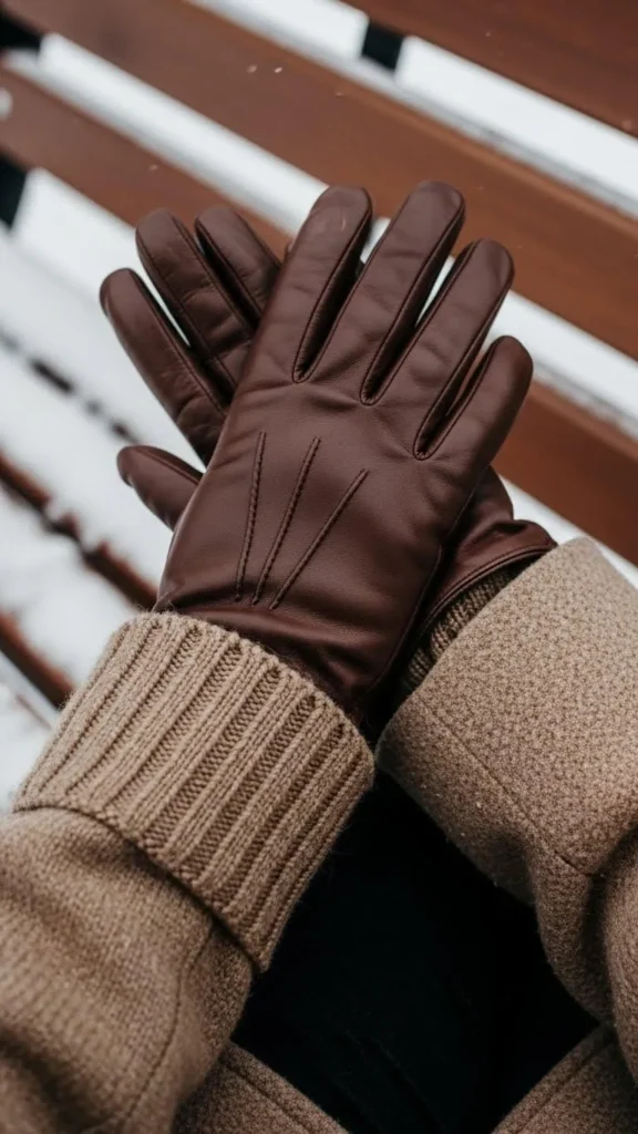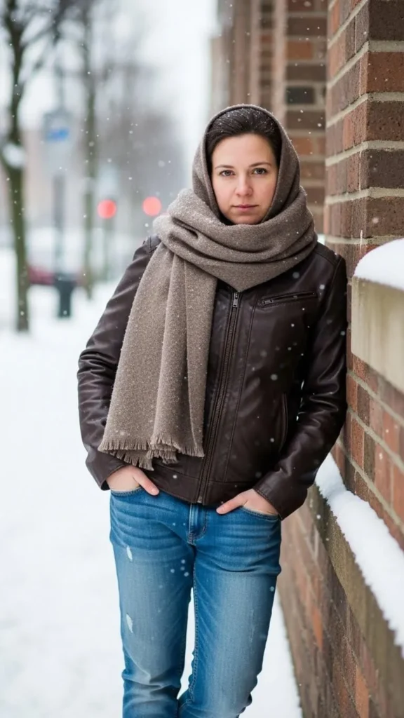 A chocolate brown leather jacket adds edge while keeping cozy. Pair with a soft wool scarf and worn-in jeans for an easy winter staple look. Leather jackets can be pricey, but thrift stores and vintage shops often have gems. If leather isn’t in the budget, try vegan leather alternatives or faux suede jackets for a similar look at lower cost.