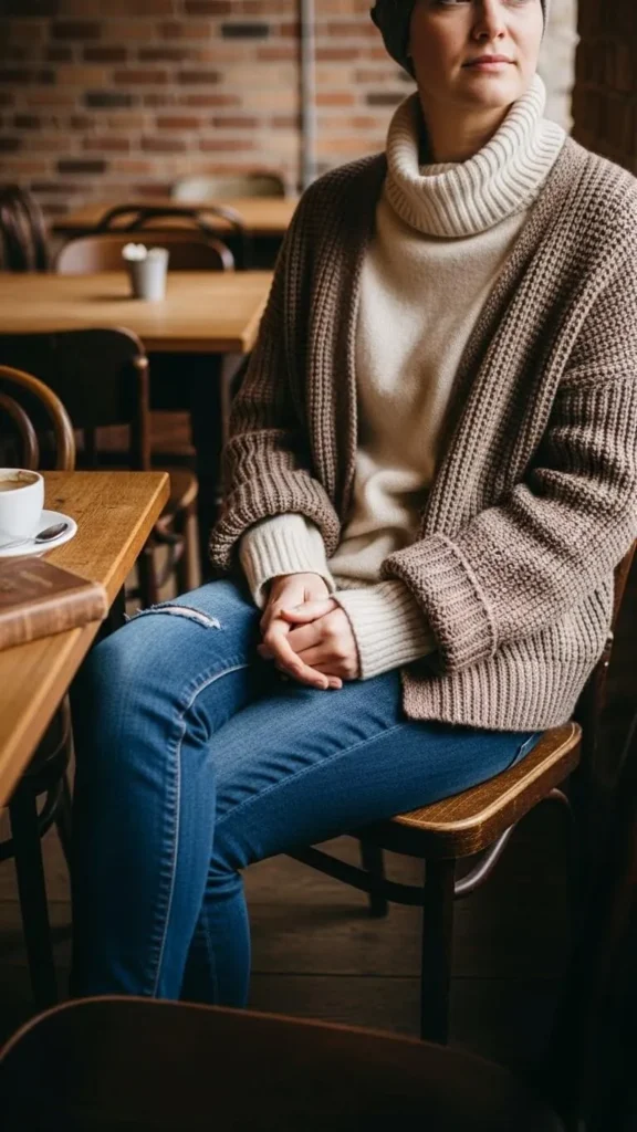A brown cardigan is a sweater option with extra versatility. Wear it over a simple turtleneck and pair with dark jeans. Choose cardigans with a relaxed fit for layering. Repurpose old blankets by cutting and sewing into cozy oversized cardigans if you like DIY. This look is great for everyday errands or cozy café hangs. Look for sales or hand-me-downs to keep it budget-friendly.