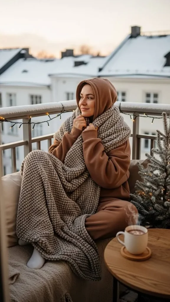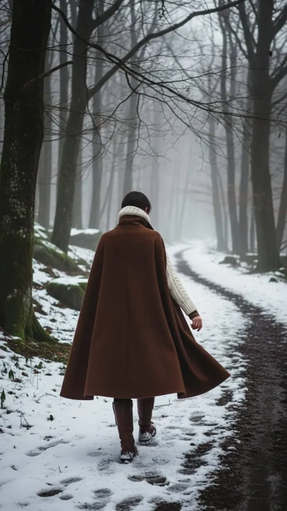 A deep brown wool cape gives your winter wardrobe a dramatic yet cozy feel. Wear it over a fitted sweater and boots for a dramatic silhouette. Capes can be recreated at home by repurposing old wool coats or blankets with minimal sewing. This look is stylish and keeps you warm from wind and cold.