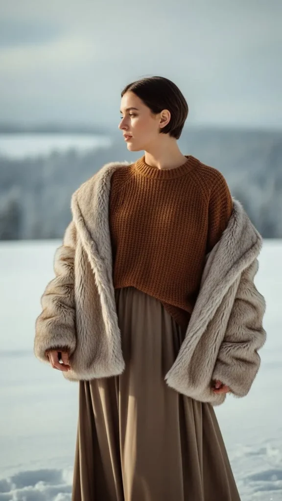 25. Earthy Brown Sweater with Maxi Skirt and Faux Fur Coat