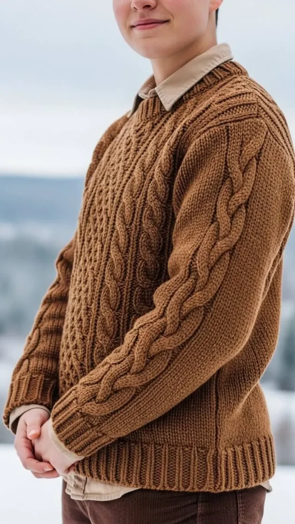 Start with a chunky knit brown sweater as your main piece. Layer a light beige shirt underneath for contrast and texture. Pair with corduroy pants or any brown bottoms. This mix feels warm and inviting. Look for sweaters at thrift stores or outlet sales to keep costs low. DIY: add simple embroidery or patches to an old sweater for a new touch. Finish with brown ankle boots or loafers for a grounded look.