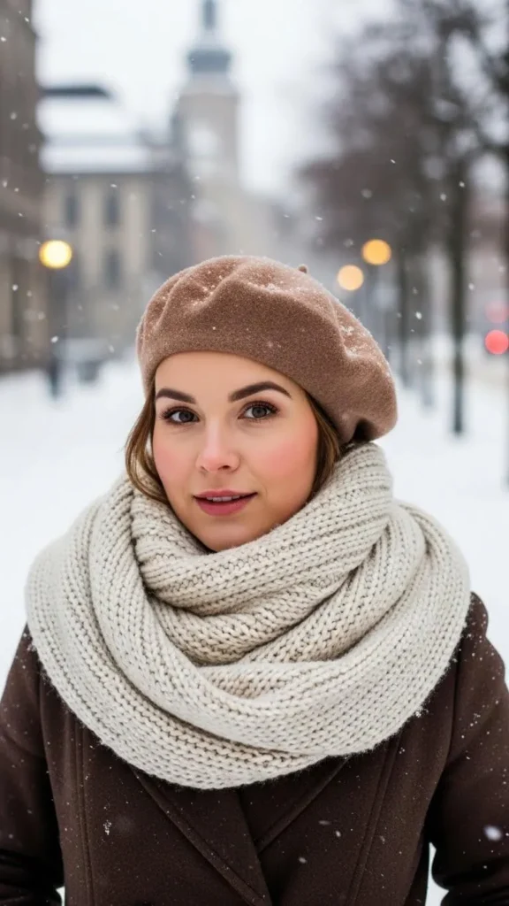 15. Light Brown Wool Beret with Chunky Knit Scarf and Peacoat