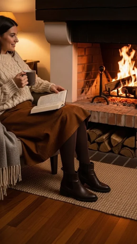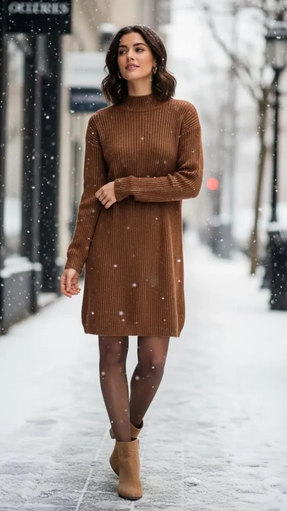 Try a ribbed brown sweater dress for a cozy but polished winter look. Layer brown or nude tights underneath to stay warm. Ankle boots work perfectly with this style. Sweater dresses often come at mid-range prices; check clearance racks or stores with seasonal discounts. If you’re crafty, repurpose an oversized sweater into a dress length by hemming the bottom.