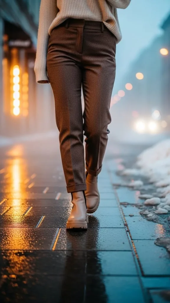 Wool brown pants are warm, stylish, and unmatched for winter. Match with a cream sweater for a clean look and wear with chunky boots. Look for wool blends for durability and affordability. If you have unwanted wool garments, consider DIY sewing into trousers or skirts. This combo feels smart but relaxed for work or casual outings.