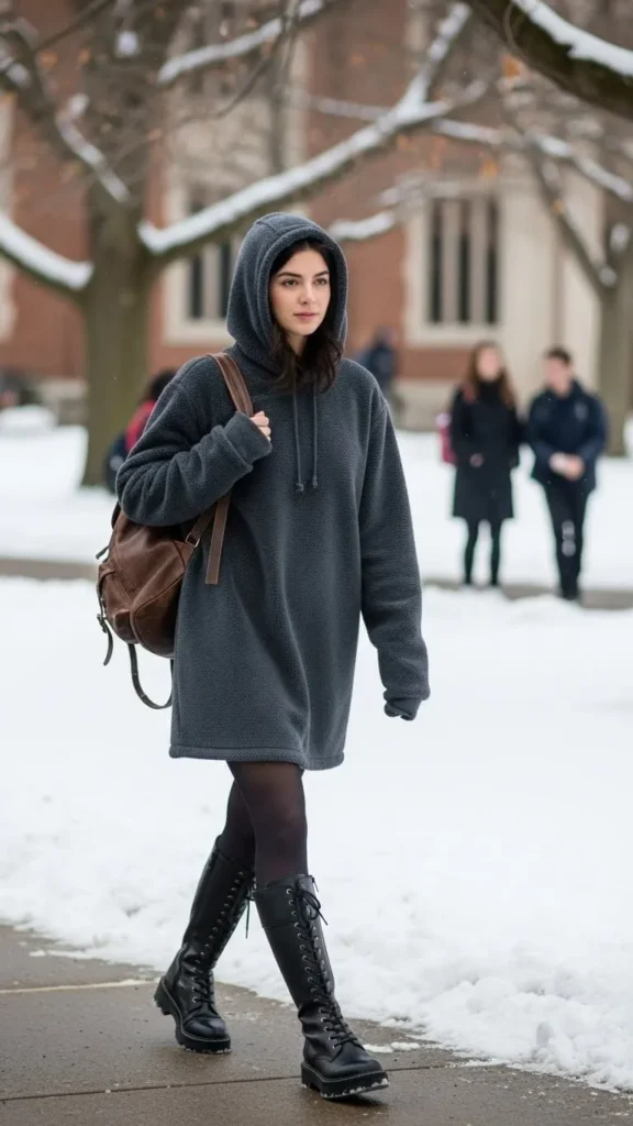 A hoodie dress saves time and keeps you warm. Pair it with thick tights for insulation. Fleece-lined styles work best.