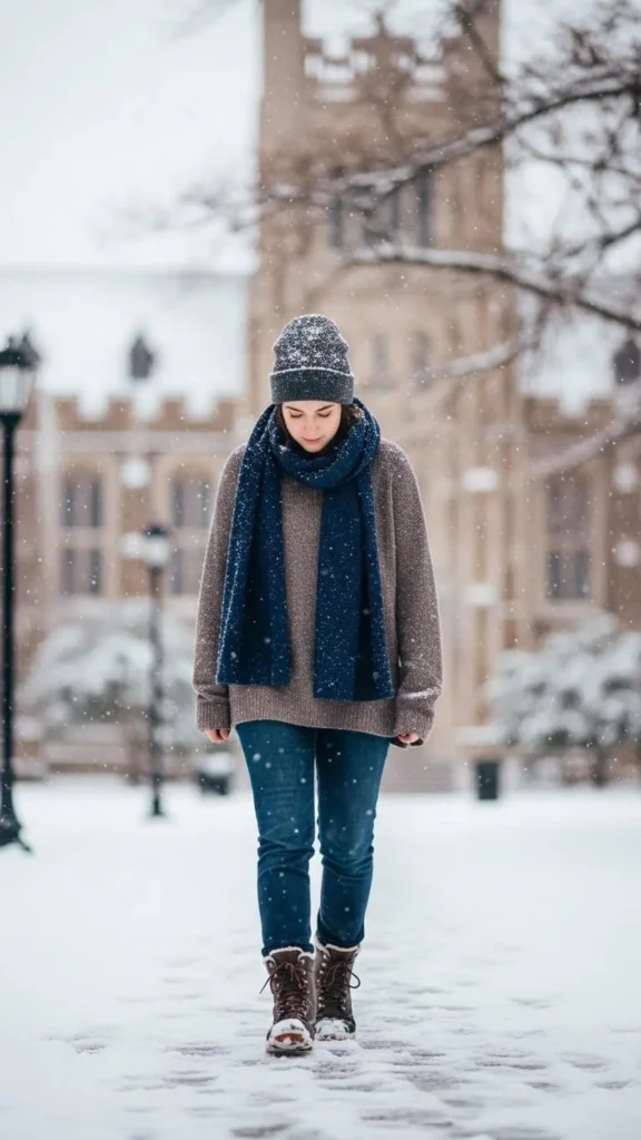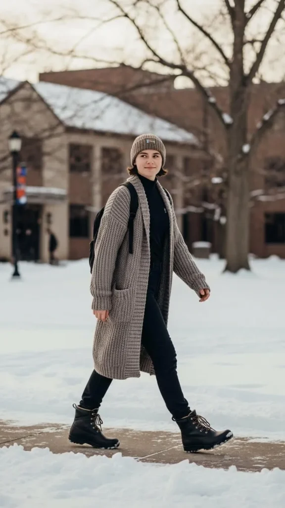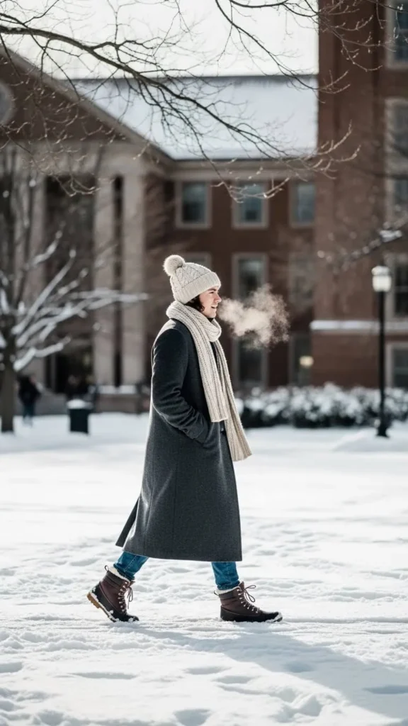 Add sneakers with grip or low boots. A beanie finishes the look. This outfit works well for labs, libraries, and casual lectures.