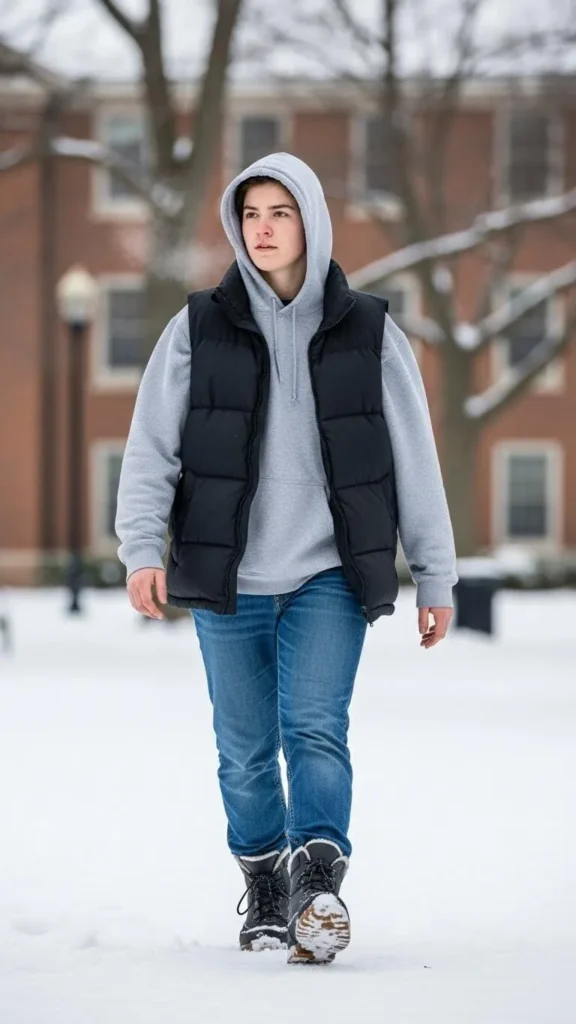 A puffer vest adds warmth without bulk. Wear it over a hoodie. Lightweight vests work best.
