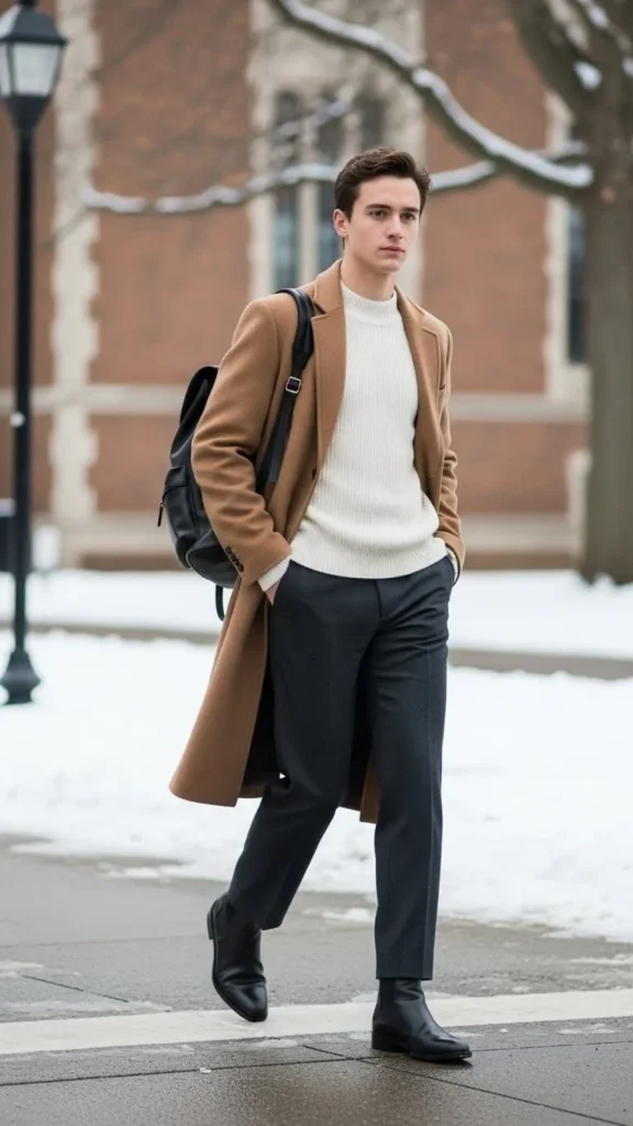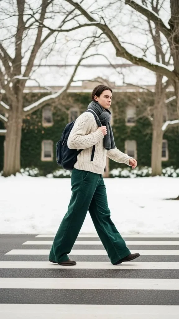 Wool holds heat well, so lighter layers underneath often work. On colder days, add a thin thermal top. This outfit feels polished but still relaxed for campus life.
