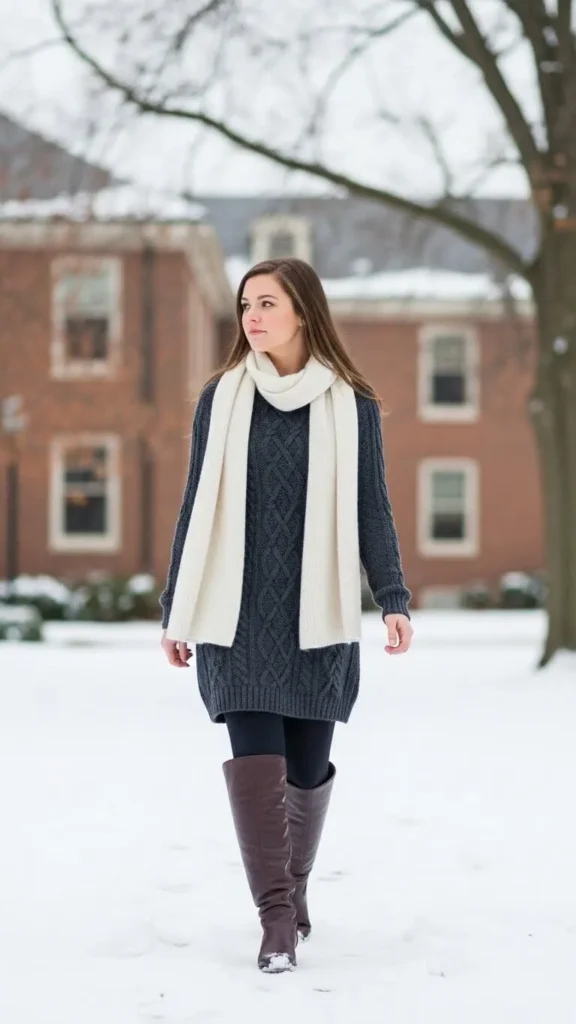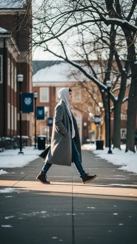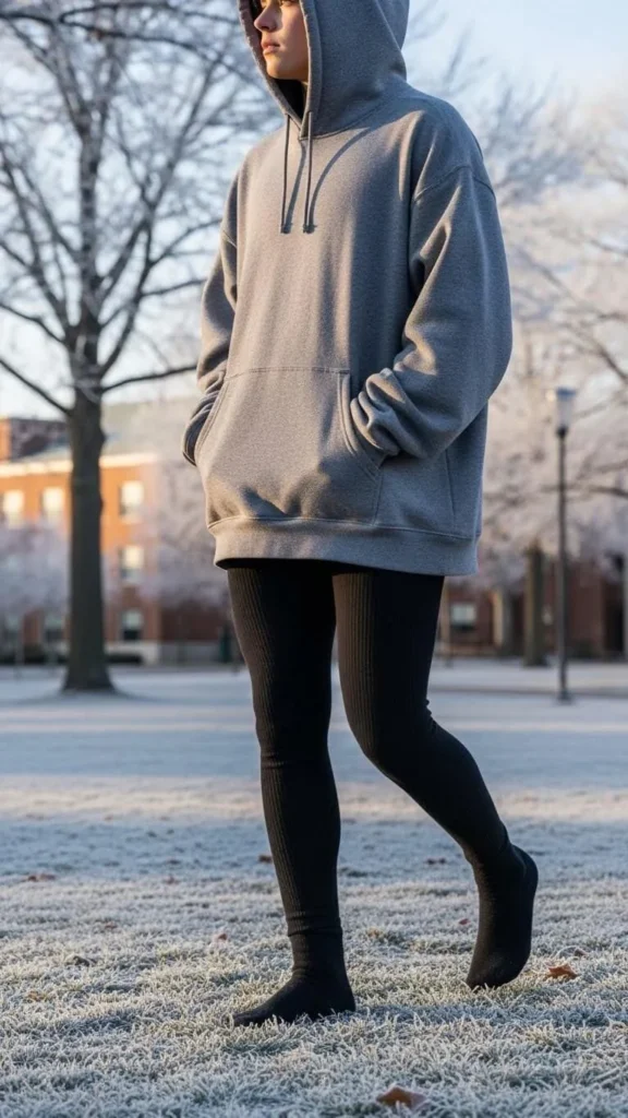 An oversized hoodie is a campus classic for a reason. It feels warm, soft, and easy. Pair it with thermal leggings to block cold air during long walks. Fleece-lined leggings cost little more than regular ones and make a big difference. Stick to black, gray, or brown so you can repeat them often.