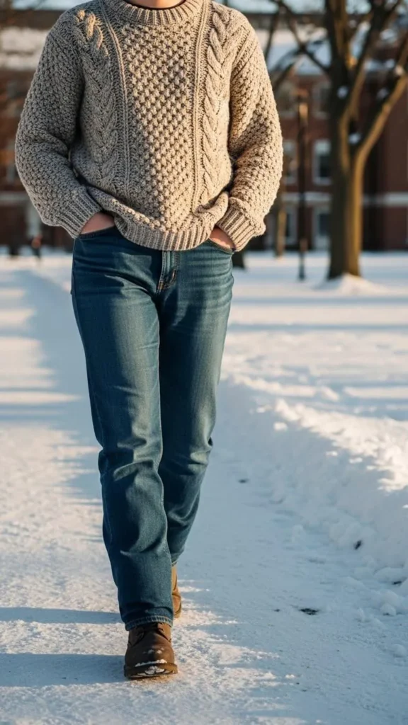 Straight jeans balance the look and work well with winter shoes. Layer a tee underneath if classrooms run cold. If the sweater feels itchy, wear a long-sleeve layer below.