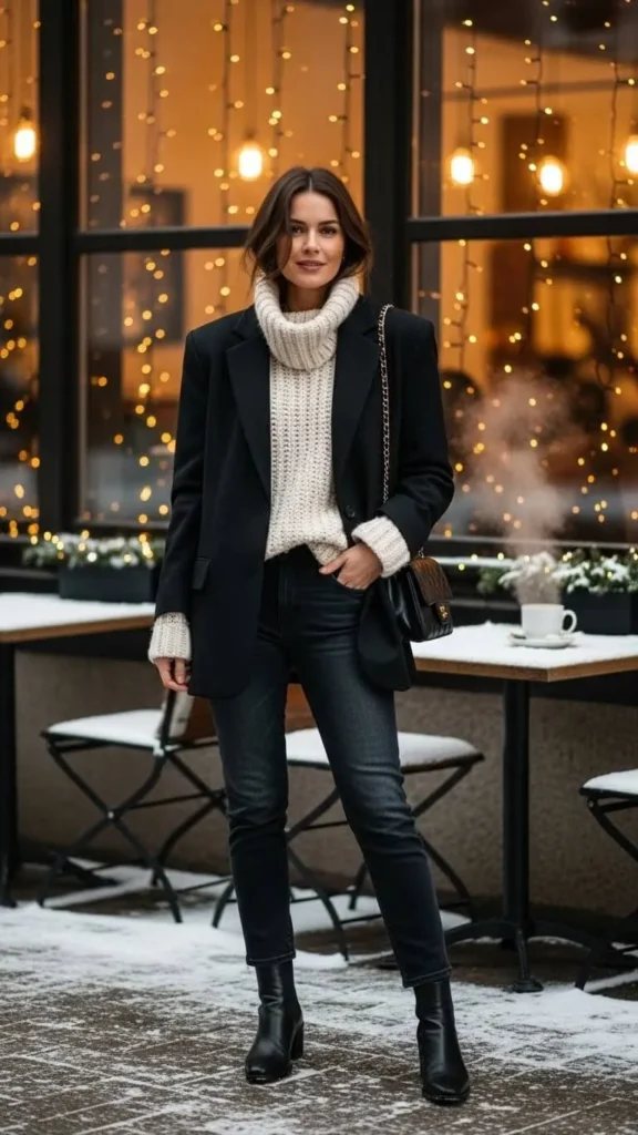 A blazer instantly sharpens any casual outfit. Layer it over a soft knit top for warmth. Dark denim adds contrast and feels dressy enough for evening plans. If you don’t want to buy a new blazer, borrow one from a friend or choose a thrifted option. Roll the sleeves slightly for a relaxed touch. Add ankle boots or simple heels. This outfit is great for last-minute plans because it comes together fast and works in almost any setting.