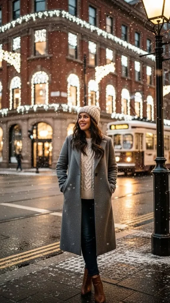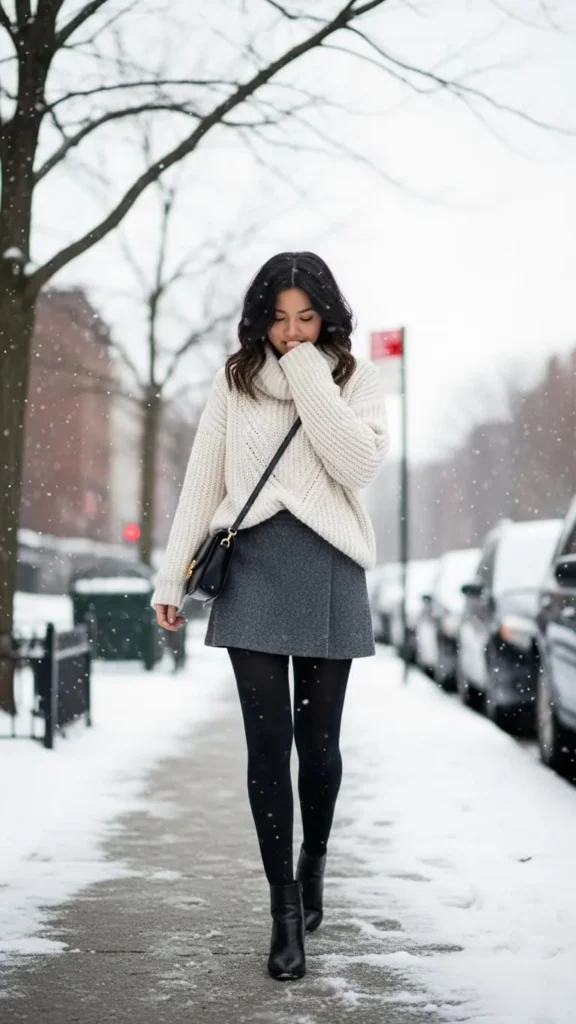 This outfit feels playful but still warm. A wool skirt keeps shape well, and knee socks add a cute layer while covering most of the leg. Add a long coat to balance the shorter hem. Wear low-heeled boots for comfort. If you’re saving money, repurpose a basic skirt by pairing it with thick socks you already own. Add a scarf for extra warmth without ruining the style.