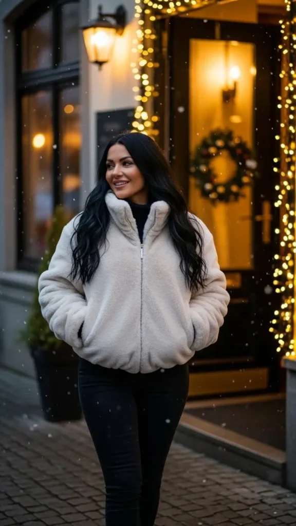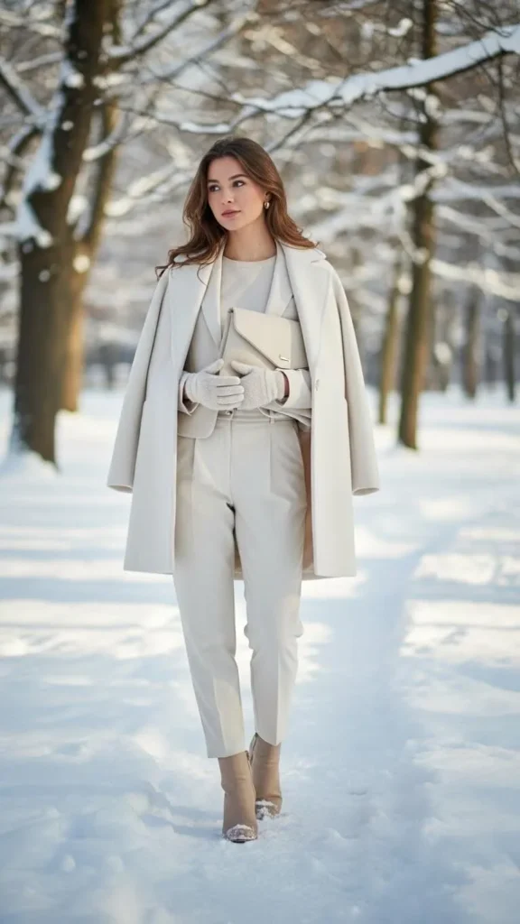 Winter whites look clean and stylish without trying. Mix shades like ivory, cream, and soft beige. The trick is using different textures so the outfit doesn’t look flat. Pair a white turtleneck with cream trousers and a beige coat. Add gold accessories for warmth. If you’re on a budget, use whatever light-toned pieces you already own—they still create the same effect. This look is perfect for bright winter days or coffee date nights.
