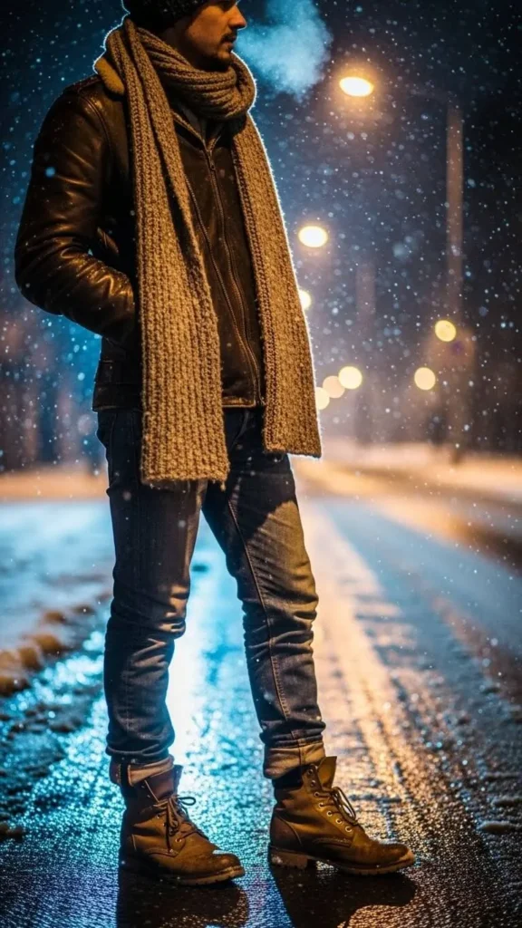 A leather jacket works all year when layered well. Add a thick scarf to make it winter-appropriate. Choose denim for a relaxed touch. If your jacket feels cold, layer a hoodie underneath. This outfit is perfect for casual dates or nights spent walking outside. If you’re on a budget, faux leather jackets work just as well. Add boots or sneakers depending on comfort.