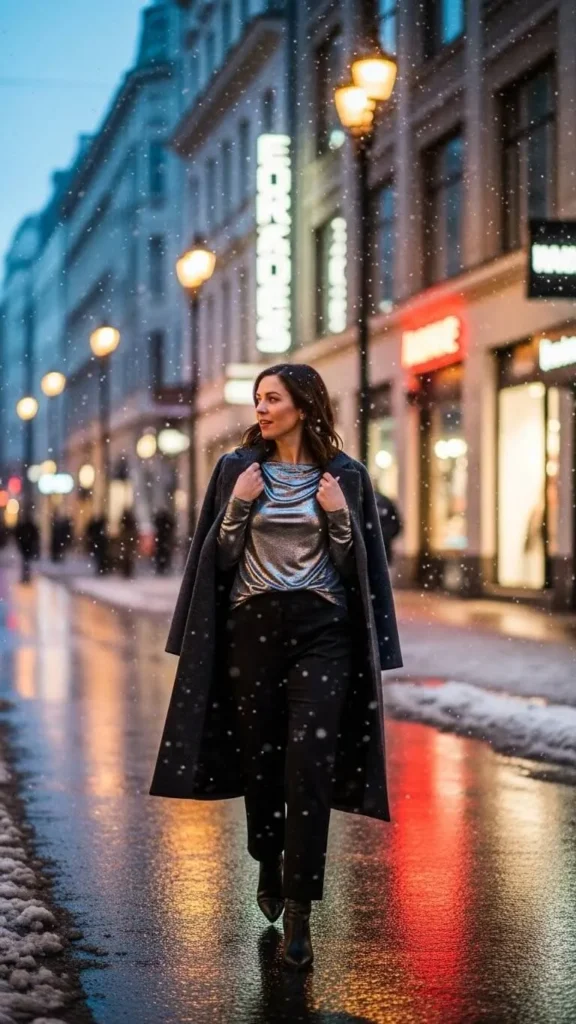 If your date night includes a more upbeat setting, try adding a metallic top. It catches light softly and works well for evening plans. Pair with black trousers to keep the look balanced. Add a long coat for warmth. You don’t need a new metallic piece; many holiday tops work for this. Keep accessories light so the texture stays the focus. Boots or strappy heels both work.