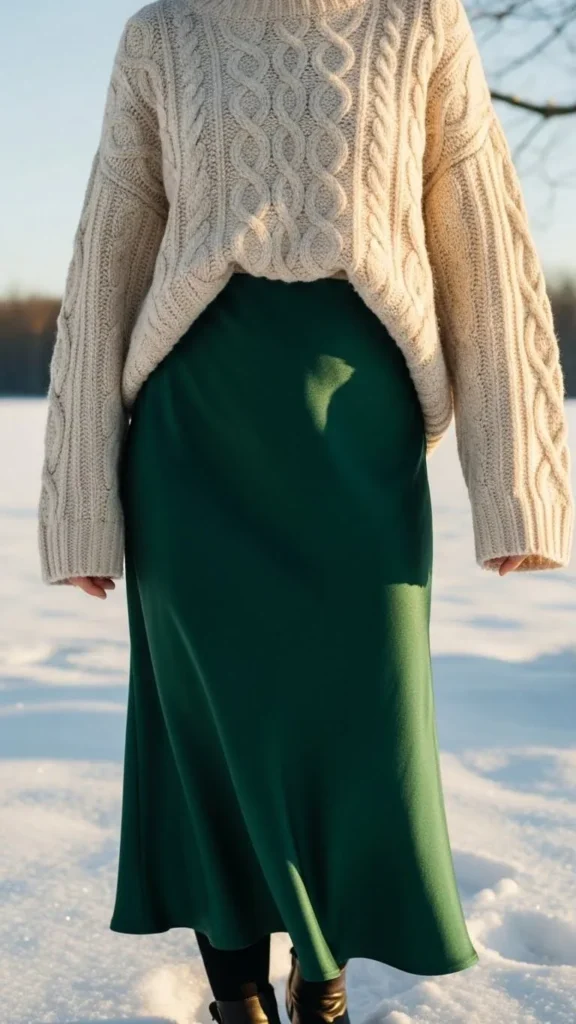 This pairing feels soft and stylish at the same time. The sweater keeps you warm while the satin skirt adds shine without feeling too dressy. Choose a neutral sweater and pair it with a skirt that has a gentle shimmer. If you don’t want to buy new, reuse your summer satin skirts and pair them with tights underneath. Add ankle boots or low heels based on comfort. To personalise further, belt the sweater or tuck just the front for shape. It’s a simple outfit that feels date-ready with barely any effort.