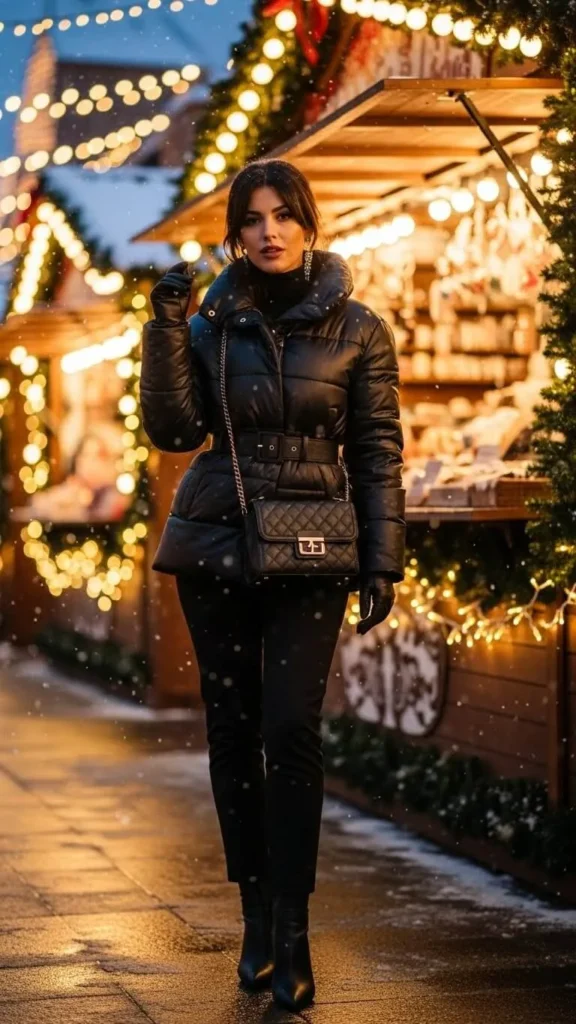 A puffer jacket doesn’t need to look casual. Pair it with an all-black base—like a black top, trousers, and boots—for a polished look that still keeps you warm. The monochrome base adds structure while the puffer brings comfort. If you already own a puffer, this outfit costs nothing to recreate. Add small accessories like silver hoops or a mini bag. It works well for outdoor dates or activities.