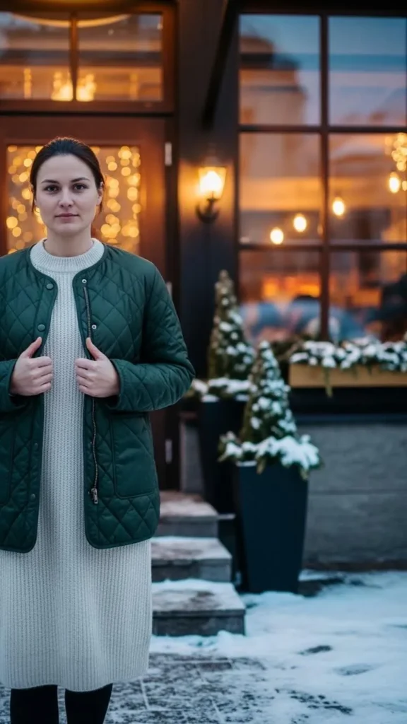 A quilted jacket feels soft and warm while a knit dress keeps the outfit simple. Choose a jacket in a muted shade for easy styling. Add tights and ankle boots for comfort. This outfit works well for dinner dates or relaxed evening plans. For a low-cost approach, rewear last year’s knit dress and update the look with a scarf or new hairstyle. Add a belt if you want shape around the waist.