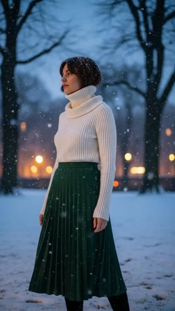 This pairing creates a soft, flowing look perfect for dinner or night walks. The ribbed turtleneck keeps you warm, while the pleated skirt adds movement. Add tights if you need extra warmth. Keep colours muted for a calm style or choose a dark skirt for contrast. You can reuse any pleated skirt from spring or summer—layering makes it look seasonal. Add ankle boots and a small handbag for a finished outfit.