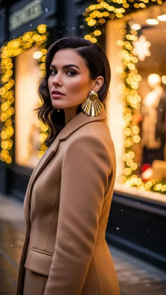 Sometimes the easiest outfit starts with simple basics. A structured coat in camel, black, or grey paired with jeans or a basic dress looks instantly more interesting with statement earrings. Choose earrings you already own to save money—bold hoops, drops, or pearls all work. A clean bun or ponytail shows them off. Keep everything else simple so the coat and earrings stand out.