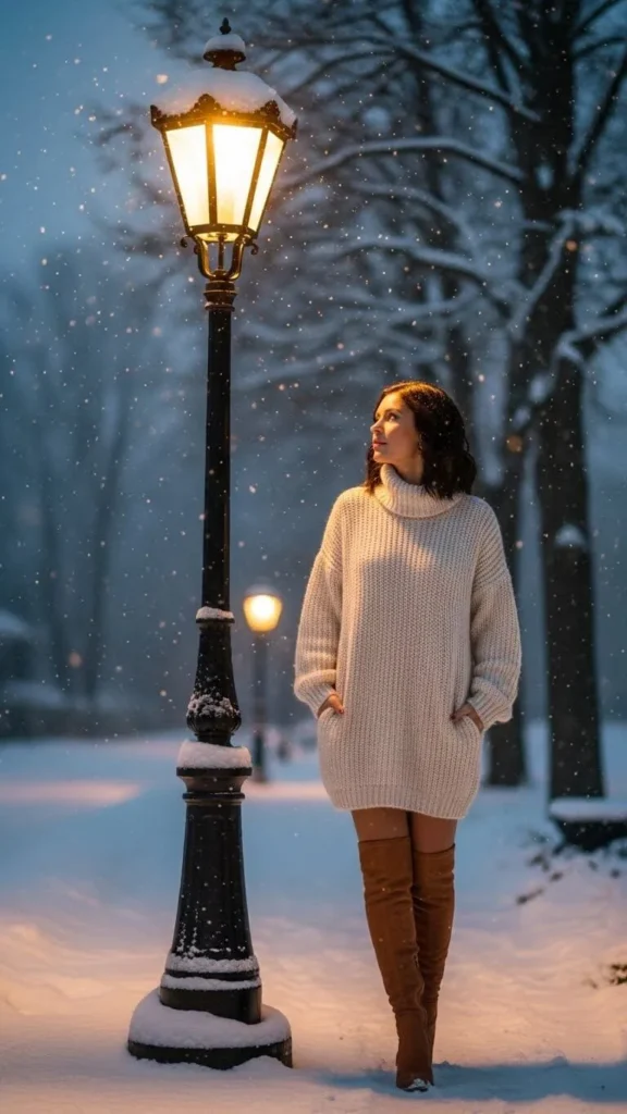 A sweater dress solves the “cute but warm” problem easily. Pick one that hits above or below the knee to pair with tall boots. Suede or leather boots both work, and they keep your legs warmer than you’d expect. To save money, reuse last year’s sweater dress—add a belt or scarf if you want it to look new. A small shoulder bag and simple makeup complete the look without adding complexity.