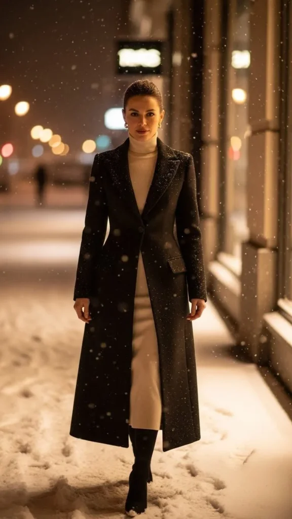 A turtleneck dress works well when you want a sleek silhouette with real warmth. Choose a midi length so you stay comfortable even outdoors. A long coat adds structure and makes everything feel more refined. For budget styling, layer thermal tights underneath—you won’t see them, but they make a difference. Add tall boots for balance. You can also throw on a belt if your dress is loose and you want shape. Simple earrings or a wristwatch keep the look clean without feeling plain.