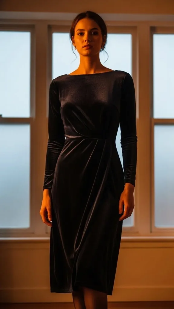 Velvet feels winter-ready and instantly dressed up. Choose deep tones like navy, forest, or burgundy. Add sheer tights for warmth with style. Heeled ankle boots or classic pumps complete the look. If you want a budget option, look for velvet dresses in thrift shops or use one from past holiday seasons. Add small jewellery pieces that don’t overpower the richness of the fabric.