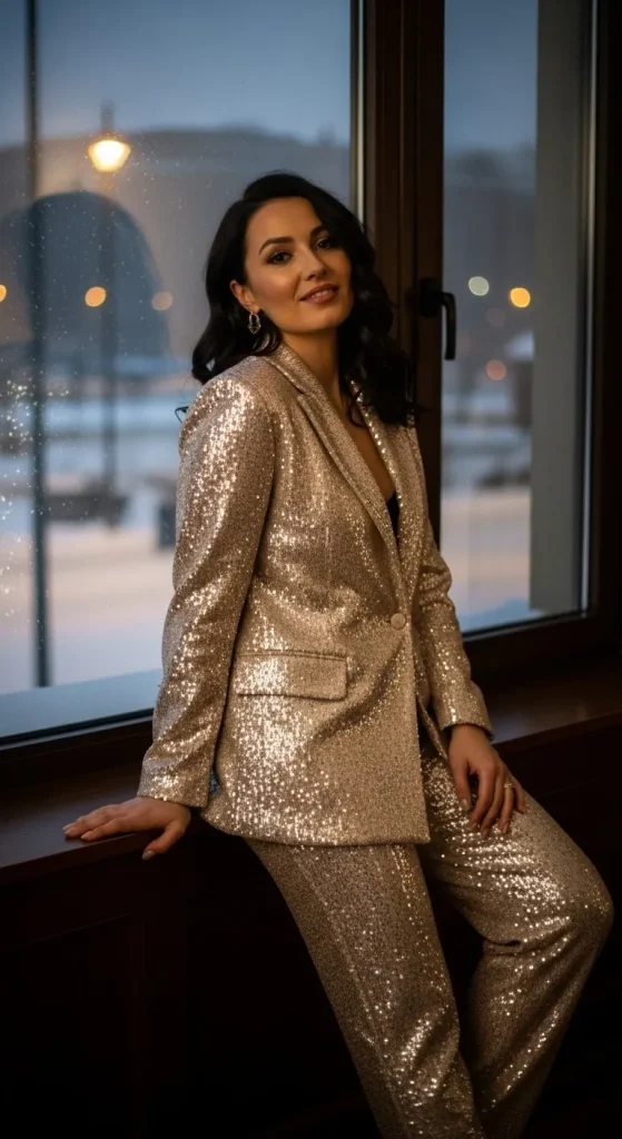 A sequin suit feels modern and festive. Keep your makeup minimal. Use a neutral clutch to avoid clashing. Find budget options in resale shops and get them altered for a perfect fit.