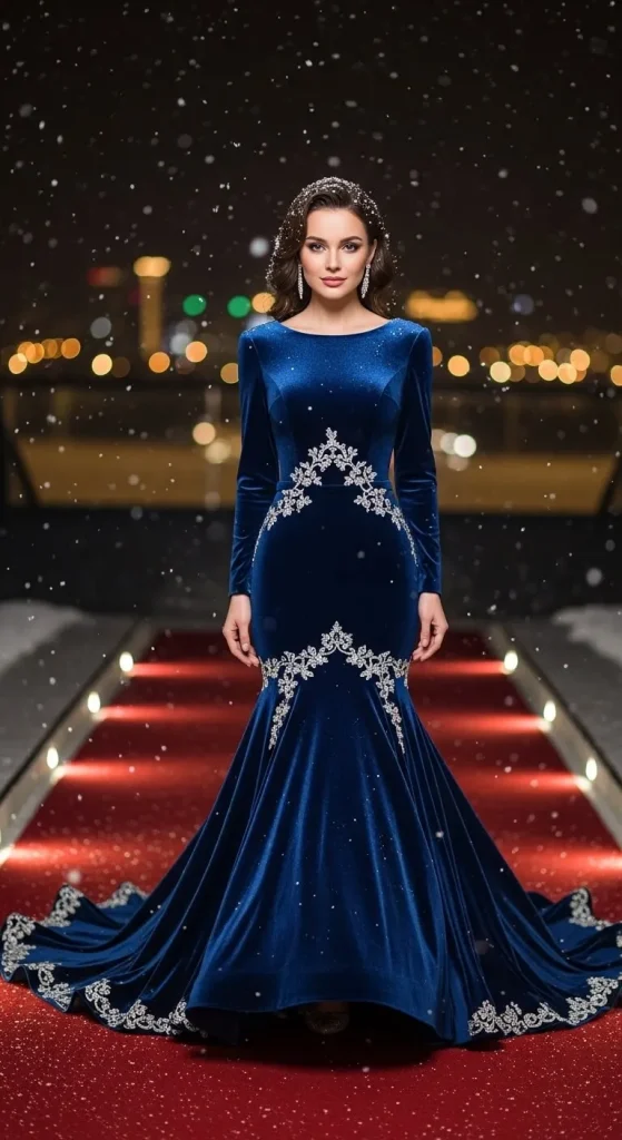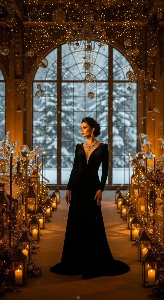 A black velvet gown is timeless for winter. The rich texture adds depth and warmth while keeping the look refined. Choose a simple silhouette with long sleeves for added comfort. Style with crystal drop earrings and soft curls. You can DIY a clutch by gluing rhinestones onto a plain black purse for a custom sparkle.