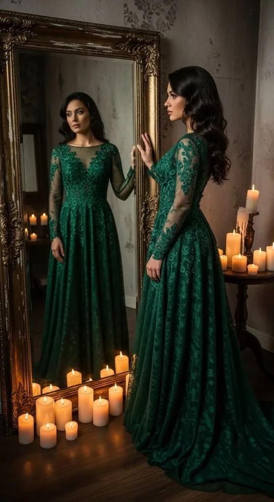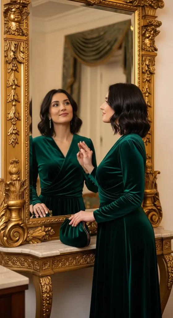 A mermaid gown flatters every curve and feels dramatic. Choose velvet or thick satin for structure. Add diamond studs or silver hoops. You can pin an old brooch to your clutch for extra charm.