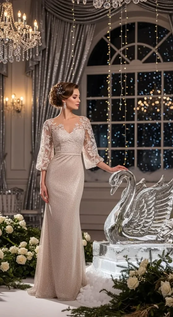 Sheer sleeves offer modesty and charm. They look elegant while keeping arms warm. Add sparkly earrings and a low bun. Use fabric glue to attach rhinestones for a custom shimmer.
