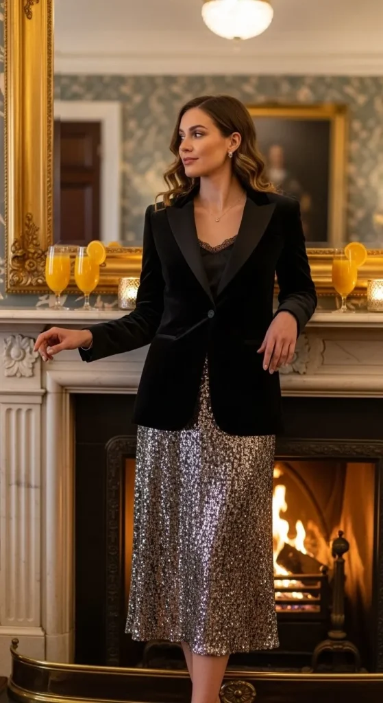 Mix textures with a velvet blazer and metallic midi skirt. Perfect for semi-formal winter parties. Use statement earrings to tie it all together. Reuse your blazer for workwear later — that’s smart styling.